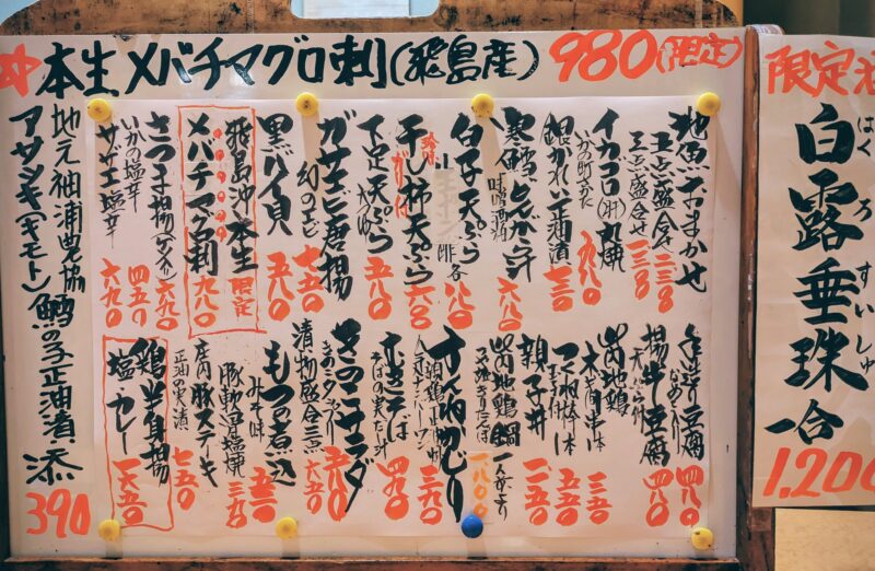 ※おすすめボードの内容、価格は仕入れ、仕込み状況により日々変更になる場合がございます。店頭にてご確認お願いいたします。又、お料理は数に限りがございます。「遅い時間は品切れが多々発生する場合もございます」 ご了承お願いいたします。内容はあくまでも上記日付け現在の時期のお料理内容です。価格は店内表示、消費税10%込み価格です。最新メニュー情報はホームページ内の別記の単品の写真付きのご紹介を参考に・・・旬の味をお楽しみください!!