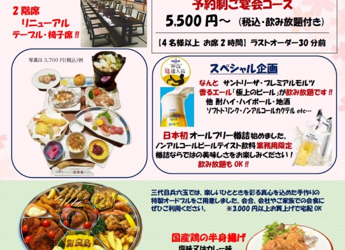 各種ご宴会・承り中!! 「食材の宝庫・庄内」、ますます美味しい食材や地酒がございます。ご宴会のプランは季節の海の素材や畑の素材・お肉を使ったコースなどいかようにも調整いたしますのでご希続きを見る→