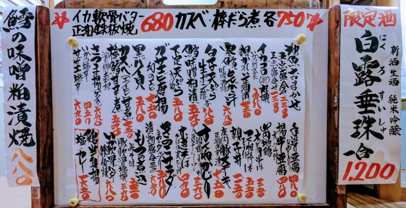 ※おすすめボードの内容、価格は仕入れ、仕込み状況により日々変更になる場合がございます。店頭にてご確認お願いいたします。又、お料理は数に限りがございます。「遅い時間は品切れが多々発生する場合もございます」 ご了承お願いいたします。内容はあくまでも上記日付け現在の時期のお料理内容です。価格は店内表示、消費税10%込み価格です。最新メニュー情報はホームページ内の別記の単品の写真付きのご紹介を参考に・・・旬の味をお楽しみください!!